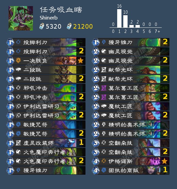 有人说恶魔猎手传说任务第三段不重要,我觉得第三段任务很重要,甚至打出来就基本可以一锤定音。关键在于做完第三段任务的时候往往手上的过牌都打空了,所以我觉得可以大胆地放弃眼棱,用投掷利刃来代替,不带或者只带一张邪能学说,加入火色魔印奔行者,因为伊利达雷研习不用承担过牌的重任,可以用魔杖工匠和伊利达雷研习找邪能学说,形成以下构筑。修改完构筑之后,很多情况5费能做完第三段任务,6费或者7费能够拍下577,后面在二段跳、空翻杂技的帮助下可以很快过空牌库,凑齐斩杀组件。而且前面两段任务在3、4费的情况下做完,也更容易在低费凑齐斩杀组件。