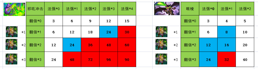 如果烧绳之后回合结束才发现自己错斩了,或者不小心把关键斩杀组件打出去了,难免会心态爆炸。表格里面列出了邪吼冲击和眼棱在不同情况下能够打出的伤害,邪吼冲击按照能打到三个随从计算。当有伊格诺斯的时候,表格里面列出来的就是斩杀线,没有伊格诺斯的时候,表格里面列出来的就是吸血量。红色部分标出来的是能够满血斩杀对手的情况,看表格的时候可以横着看,先考虑自己有几个莫尔葛工匠,然后根据场上法强看能打出的血量。