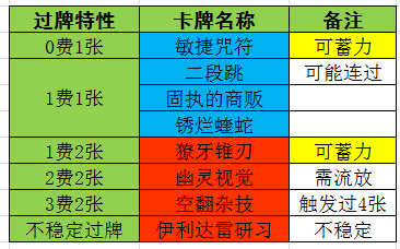 表格里面罗列出了过牌组件的特性,其中,蓝色的卡牌可以过1张,红色的卡牌除了伊利达雷研习之外,都可以过两张。备注里可蓄力的意思是可以通过提前计划,达到做任务的当回合节省费用的目的。