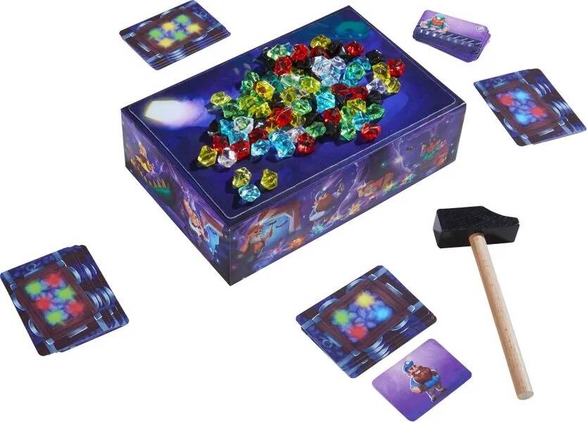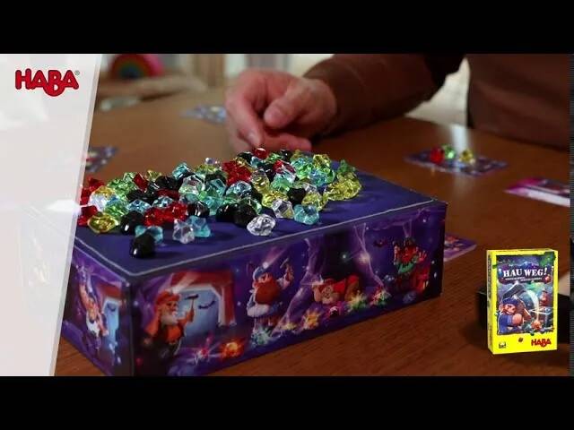 以HABA的一款新游戏《Hammer Time》为例,这个游戏中孩子们扮演在矿井中采集宝石的小矮人。他们要通过用锤子的敲击令盒中的宝石掉落。但由于每位矿工都有自己的任务,所以收集到的宝石是有数量和颜色要求的。而且敲得太猛的人会吵醒宝石洞窟的巨龙守卫者……第一个用所需宝石装满四辆马车的小矮人就是赢家。