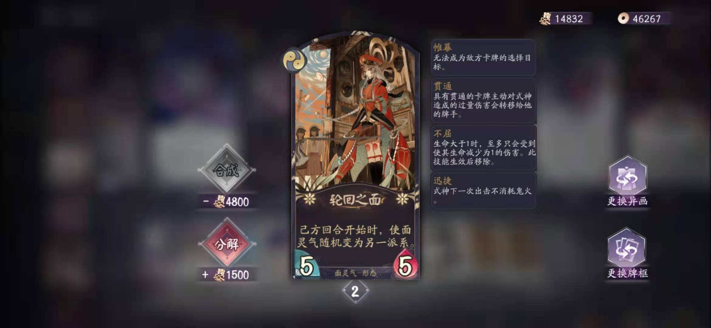 1张面灵气的自欺。这个版本解后场太重要了,有些式神在后排挂着能一直触发特效、有些式神须在关键节点解掉,自欺的重要性不言而喻。