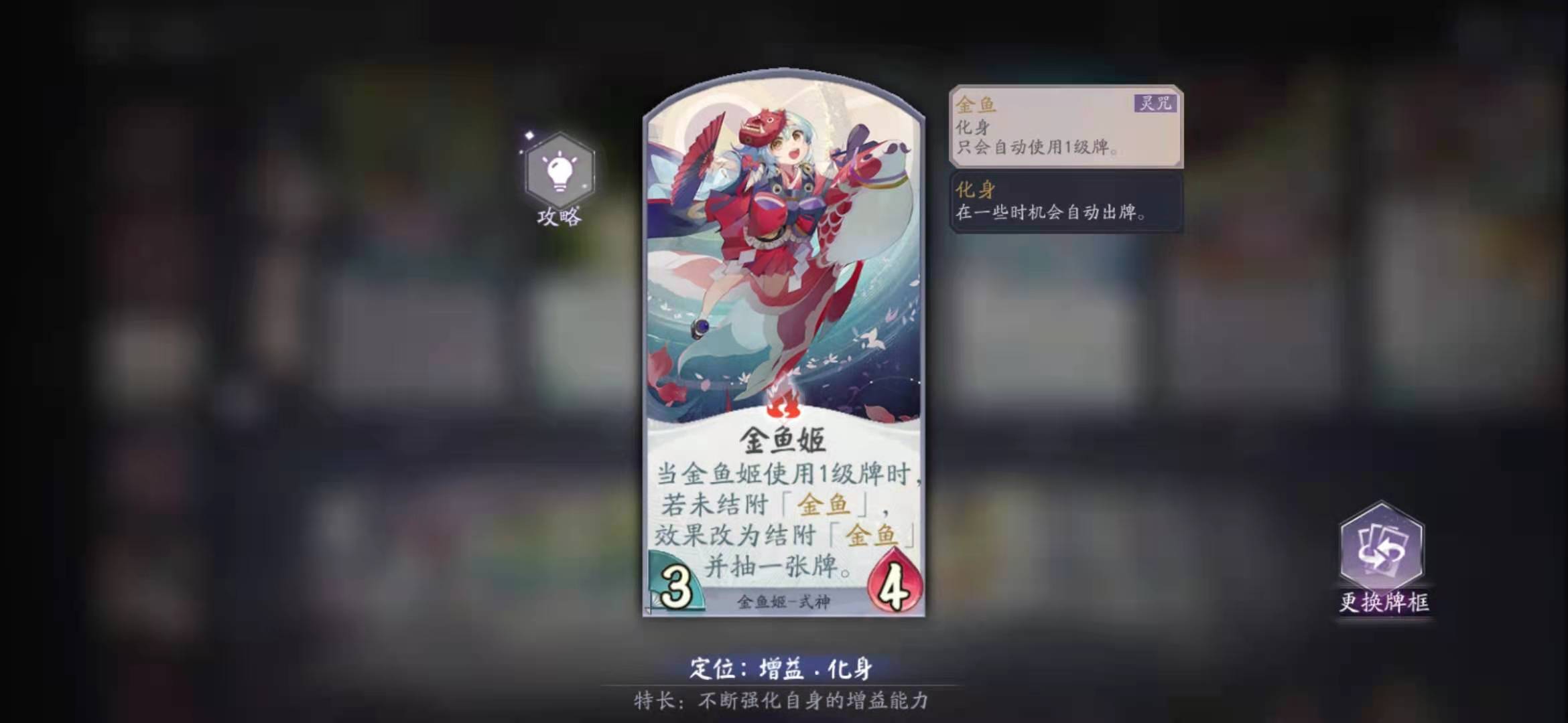 在你抢夺战斗区时,金鱼姬会考虑双方式神的状态,如果放对方式神(如荒骷髅)回去也不会对你的式神造成太大影响,那么金鱼姬会给你的式神加身材;