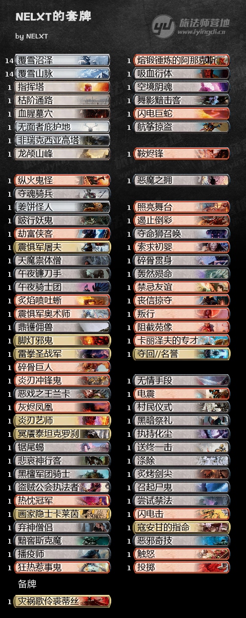还想说点关于卡组的卡牌替换,我上面说过生物的选择原则。但是我也选了一些人个人偏好性的牌进去,总体来说调整度也是不小的,如果缺稀有,秘稀什么的就按规则找点生物替代就行,2费进场弃牌的生物就很不错。地牌一定不要选会横进的,单色无色功能地统统都不需要,这套牌地的数量只有34张,稍微卡一卡节奏就很崩盘,无面者庇护地我也是作为一个补刀塞进来的,效果马马虎虎,如果选择剃掉,记得把所有地换成普通地,雪境地吃英灵神瑞丹妮。选牌进去尽量少选需要单色两点的牌,超过两点基本不要考虑,威世智发地程序非常折磨人。法术瞬间的选择有两张我想提一下,一个是炙烤剑尖,瞬间能过牌,同时配合指挥官能让所有非衍生生物变成去除,真是非常棒。另一个就是尝试禁法,能主动牺牲生物加过牌,数量还是任意,最高光一次,是生物全踢完全牺牲配合指挥官斩杀。叛行类的法术也可以考虑多带点,说真的也是非常好用,可以替换黑暗祭礼,恶戏之王兰卡,这两张卡真的是我个人偏好带进去的,多带了就可以塞一张巫婆炉灶,偷过来方便牺牲,还能配合鼎镬佣兽,经典两卡小combo。生物比例也可以提高,优先替换回收类的法术瞬间。