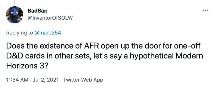 问:AFR 是否打开了在其他系列中放进单张 D&D 的牌这件事的大门?比如像是"摩登新篇 3"?