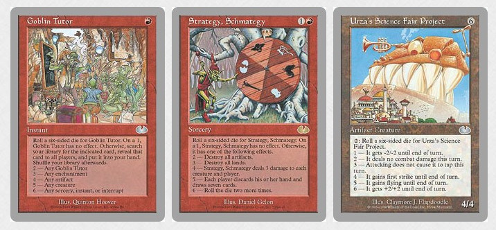 Unglued 首次把掷骰子带进万智牌。当我们收到关于系列市场调查的资料,发现很多掷骰子的牌都高居玩家最不喜欢的牌列表张中。所以当在制作 Unhinged 时,我并没有使用掷骰子。然后我就收到了很多玩家的抱怨:它们很喜欢掷骰子的牌,对于没有再次看见这些牌感觉很失望。这让我回去检视原版 Unglued 的市场调查。结果显示大家不喜欢其中一些掷骰子的牌,但其他的实际上十分热门。