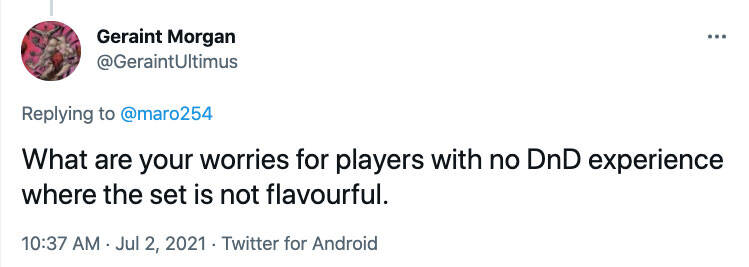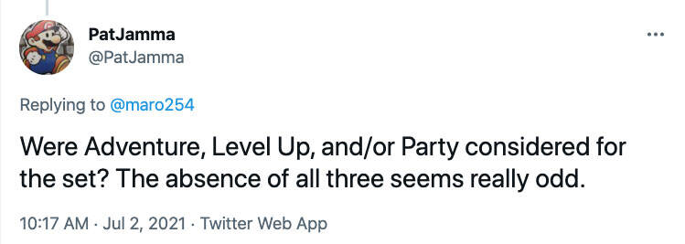 在过去我们曾小心尝试像是 百宝囊 这样的东西,但现在万智牌 里已经有了 D&D 的产品,我想我们应该会为它们保留这些东西。当然,如果情况变成看似不会再制作更多 D&D 的产品,或许我们会重新考虑,但既然我对未来万智牌里有更多 D&D 的产品这件事感到乐观,我怀疑我们会再在非D&D 的万智牌系列里塞进D&D 的单张牌。当然如我常在我的部落格上所讲的,永远别说不可能。
