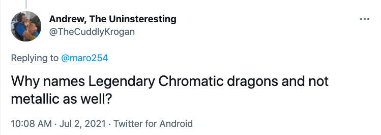 如上所述,有很多玩家希望在 D&D 系列里看到的东西,所以我们试着把那些跟我们会放在牌上的东西混合。当五色龙填上了那个空间后,很难再去制作一支传奇的金属龙,因为这个系列里已经有了很多龙。我们并非对金属龙有什么意见,只是它们并没有像五色龙一样那么契合。如果未来再制作另一个 D&D 的万智牌产品,我很确定我们会再给金属龙一次机会的。