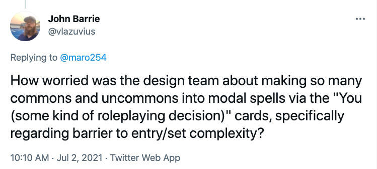 问:设计团队是否担心以"你(一些角色扮演的决定)"的方式,把如此多的普通牌和非普通牌做成模组咒语牌会有问题?尤其是关于系列进入门槛及系列复杂度的部分。