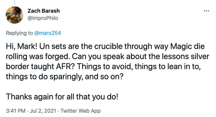 问:Mark 你好!Un- 系列是万智牌中掷骰子所经过的严酷考验。你是否可以聊聊 AFR 从银框牌经验中所学到的东西?哪些该避开、哪些该使用、以及哪些应该更加保守等?再次感谢你为游戏所做的一切!