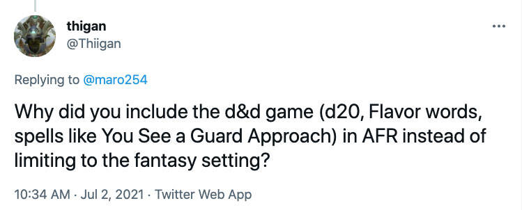 问:你们为什么在AFR 里也引进了 D&D 的游戏内容(d20、风味文字、像是你看到卫士走来这样的咒语)而不是只限于奇幻的设定?