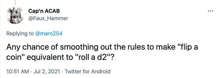 我很喜欢讨论背后逻辑的问题。硬币是否等于两面骰?各个游戏的玩家已经争论这个问题多年,我个人的答案是否定的—至少是在"硬币不等同于骰子"那边。举例来说,硬币可能会有三个结果(其中一面、另一面、边缘,没错这三个出现的机率并不是一样的),所以理论上来说它也不是只有两面,而我认为骰子的关键是可以被掷出去。确实有可能制作一个两面骰,像是只会有两种结果可以掷的骰子,但那并不是一般玩家可以轻易获得的东西。