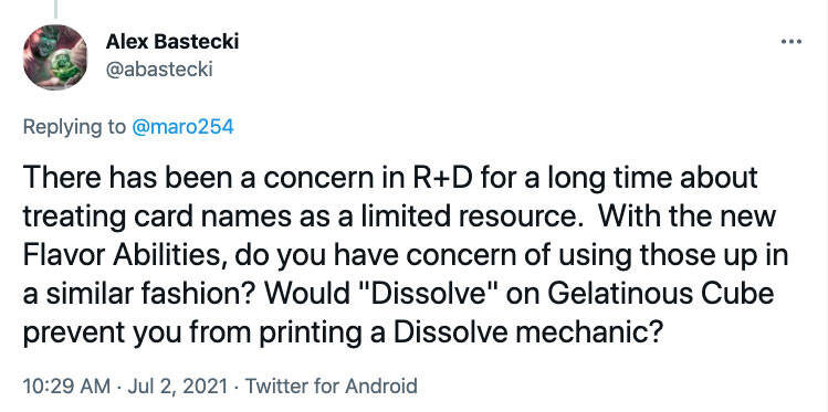 问:R&D 一直对于把牌的名称视为有限资源这件事有些顾虑。在有了新的风味异能后,你是否会顾虑以类似的方式使用它们?凝胶怪上的"消化(dissolve)"风味文字(译注:此处原文与牌张"消融"相同)是否会妨碍你制作消化的机制?