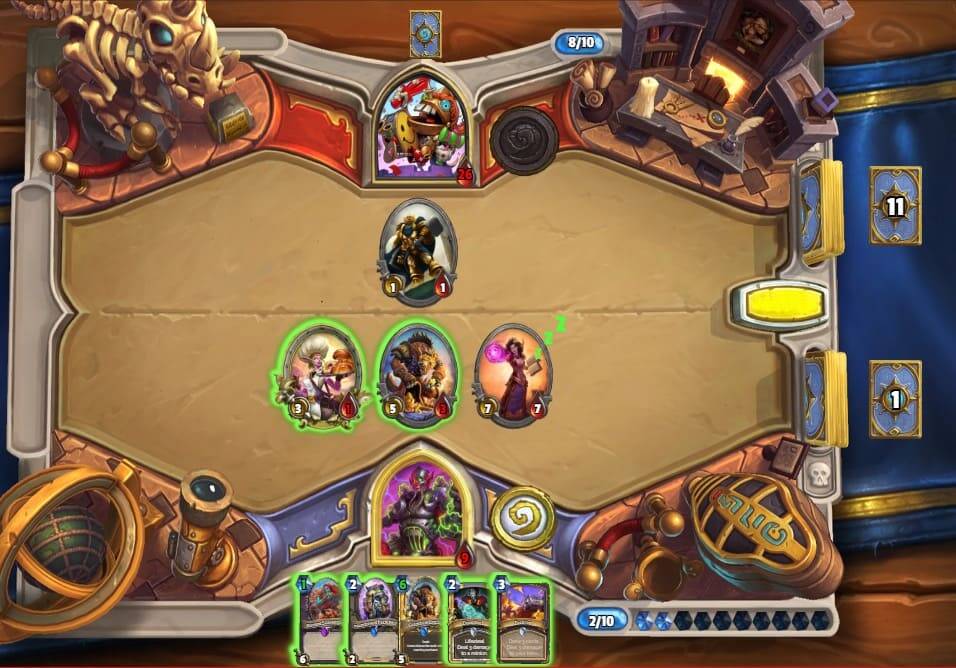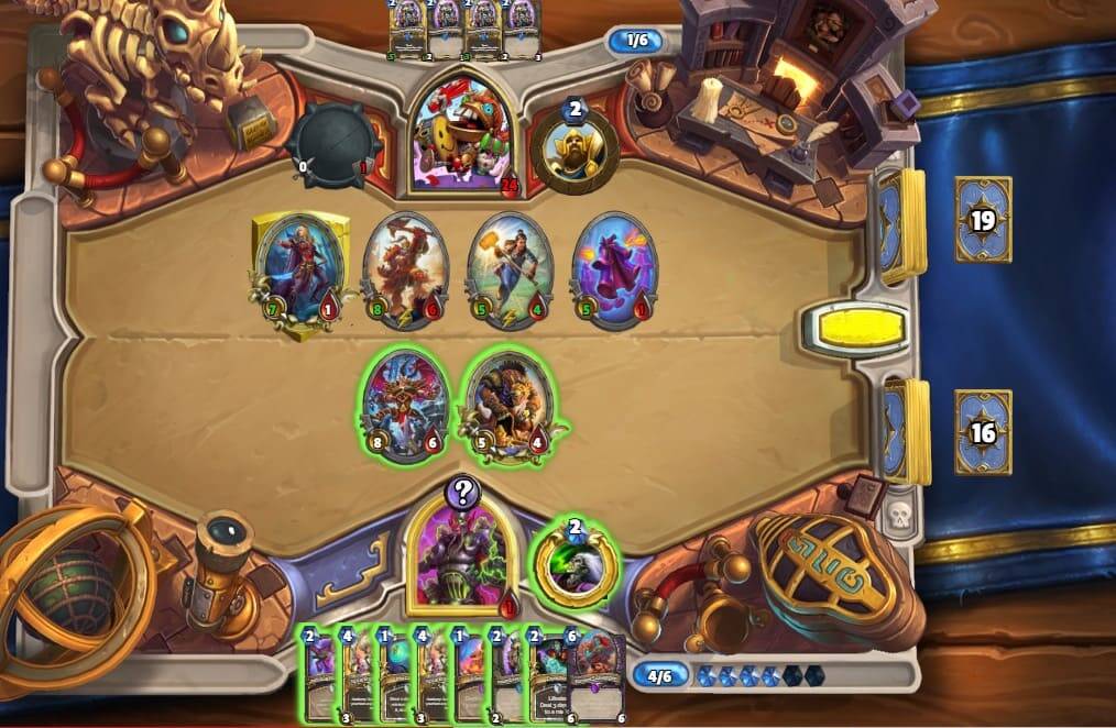只要牢记,不靠任务赢,只靠场面赢,就能最大化胜率。这种对局谁先下巨人谁的胜率就会更高。我们虽然没有活化扫帚,但凭借5/4突袭和其他解场牌,还存在一波解场的机会。