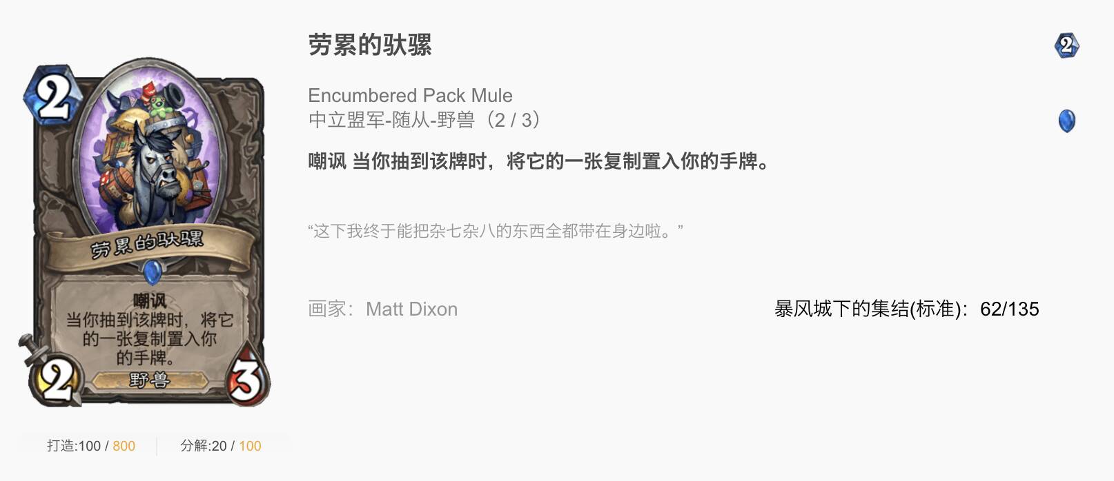 劳累的驮骡作为整个卡组的润滑剂,也是提速组件。很多情况下使得闪金镇豺狼人和安塞纳隆可以更早一回合出手。唯一的副作用是在使用赛车回火时有可能爆一张牌。但这点损失对于我们来说无足轻重,毕竟我们就算不爆牌自己也会撕。