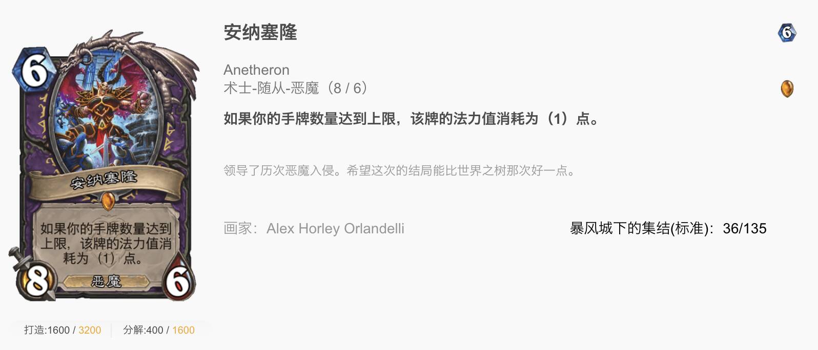 安纳塞隆是一张中规中矩的卡,虽然也没有预览时那么拉垮的感觉,但作为手牌体系最贵的大哥,在4,5费的表现也可以称得上名副其实。一般在四费时可以打出,且必定是1费,如果手上还有豺狼人,在4费时便可以1+抽1+1打出8/6和5/4的场面。