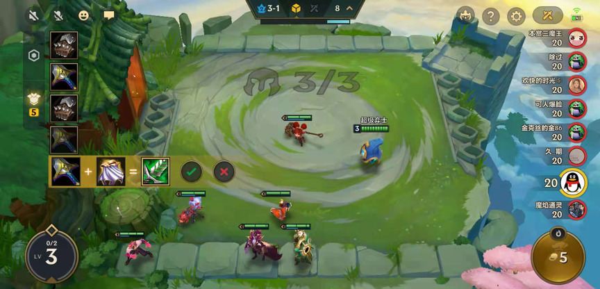 装备、羁绊等信息被收纳在对局画面左侧,玩家可随时点击相应按钮察看,同时可在装备区拖动散件合成高级装备,长按则可查阅装备属性。