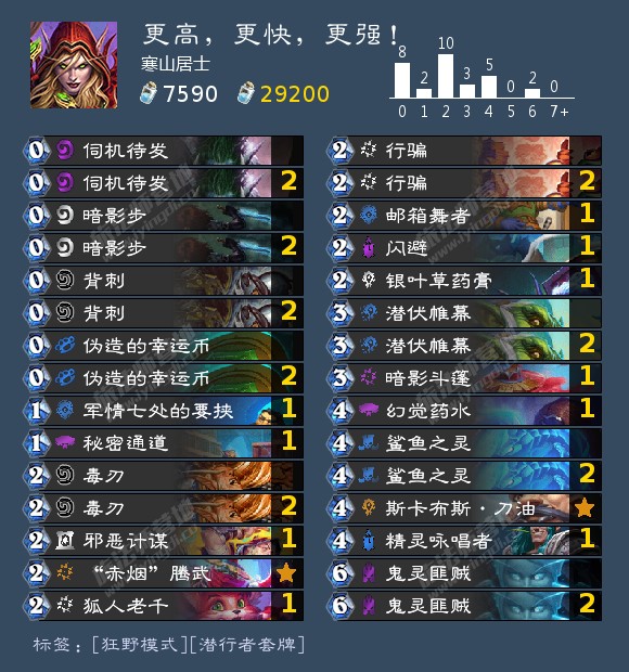 在原有的1.0版之上,删减了不少随从。包括使老千、鲨鱼与咏唱者的数量直接减半,但依旧没有放弃舞者。原因很简单:在面对奥秘法的符文时,舞者相当于一费的触雷。在面对奇数打脸德以及OTK手中低费弹药过少时,舞者也能发挥其优势,舞者的存在可以轻松将斩杀线提升到30+,我也经常性地打出50-60点的伤害。而在超凡德归零的上个回合如果有鲨鱼,舞者的存在也为我们斩杀提供了机会。