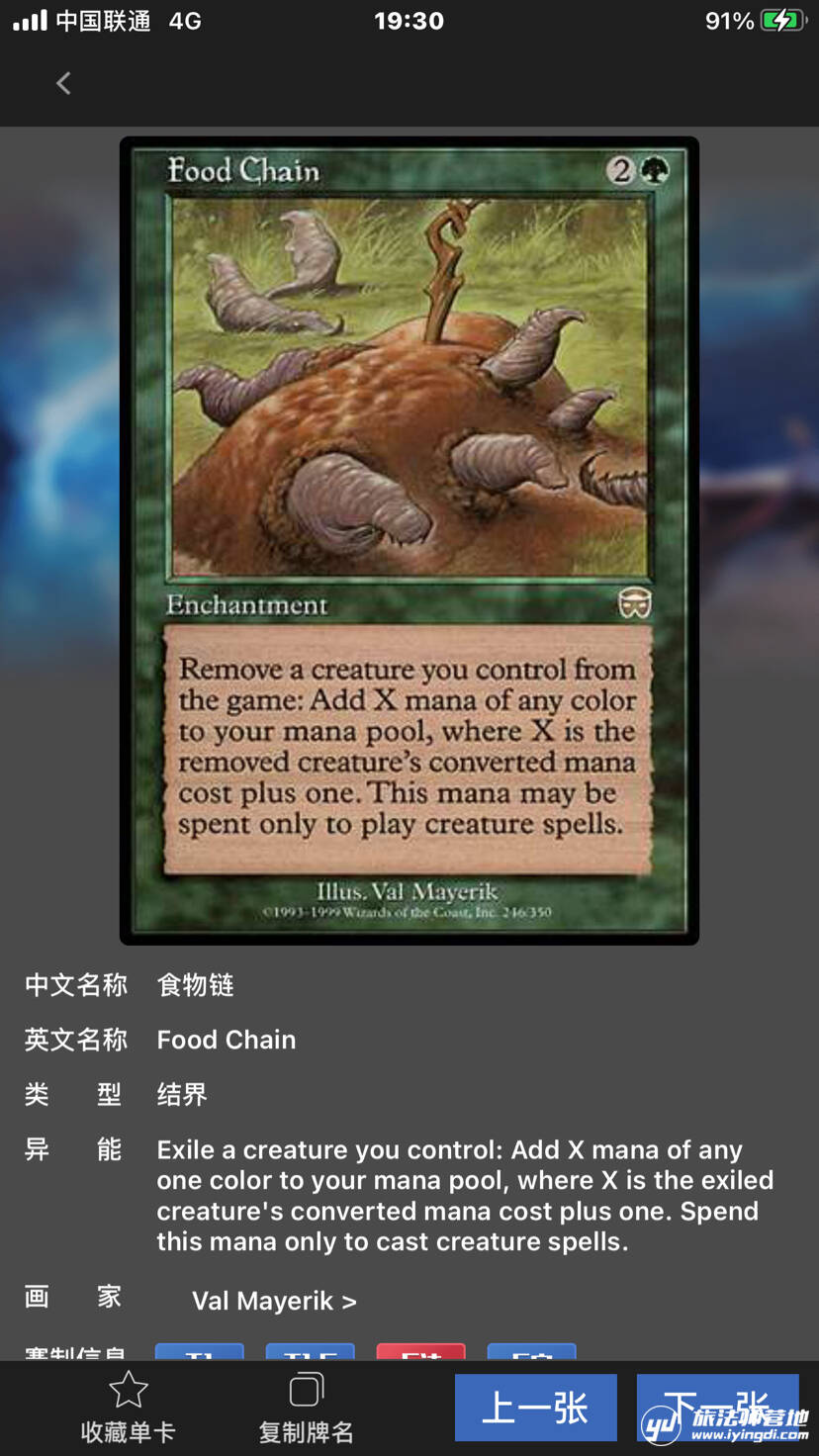 食物链效果:放逐一个生物然后加放逐的目标生物的释放费用减1也就是4费释放雾谷狮鹫,可以通过食物链获得3费,而雾谷狮鹫本身可从放逐取释放,也就是说可以达成一个(伪)无限费,再利用楚兰的异能抓起牌库。