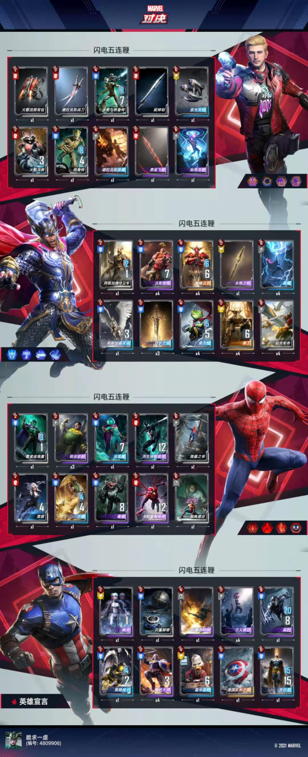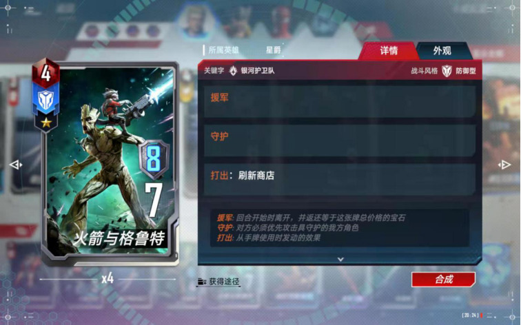 4、本卡组携带了两张援军角色,中期的时候一定要打出,可以无偿滤牌库,霍华德鸭可以白赚1宝石,火箭与格鲁特实际上还白赚取一次刷新的机会;