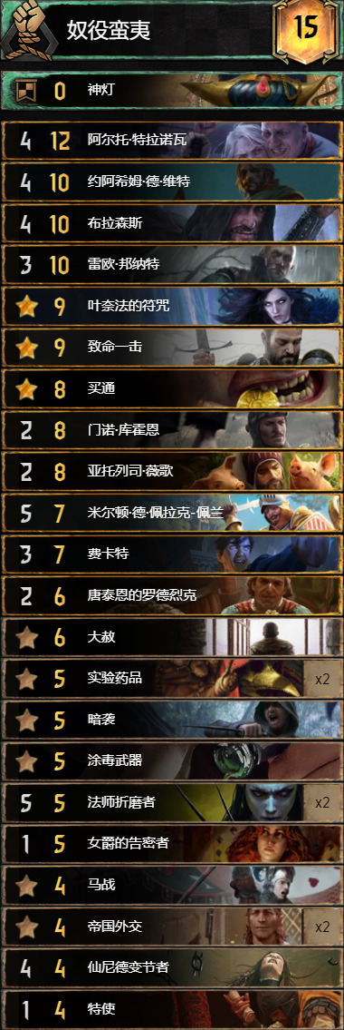 单卡替换:单卡替换方面非常自由,2张大解牌或者亚克席,可以替换为坤恩/马多克/哈尔玛之类的牌,但这两种在面对帝国时都有内鬼的风险,所以建议根据当前环境来替换。