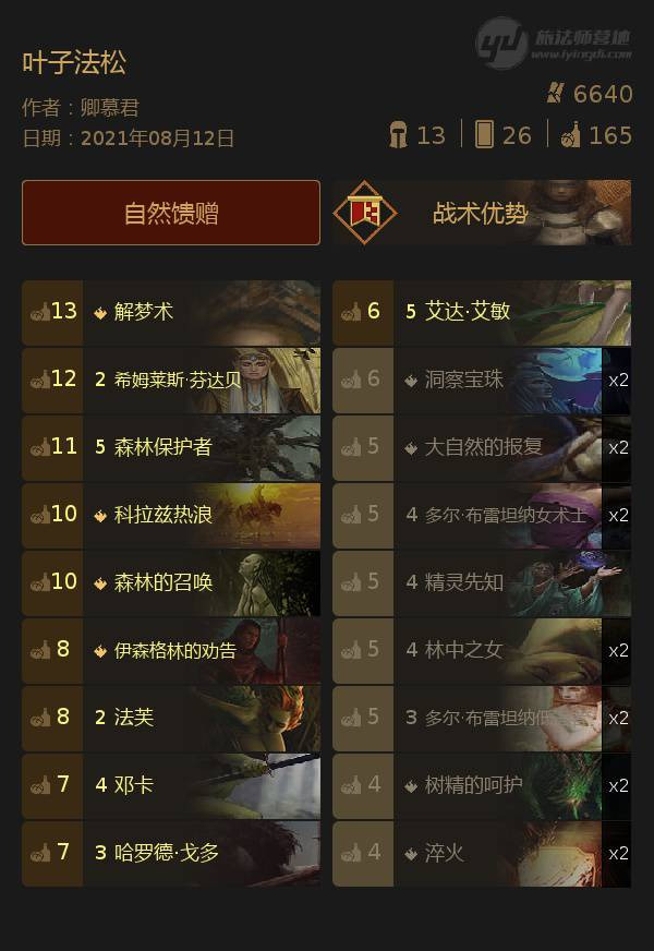 沼泽果实因其能提供给狮鹫目标且能与夫人配合成为了林妖以外的领袖选择;而林妖还是与科斯切依配合有着更高的爆发。个人更推荐蛆妈。上面这套牌组仅有6p8p两把锁和一张打6作为控制,而注重触发成长引擎提高己方点数。舍弃了解梦选择了降p的皇家和马克西作为检索体系。利用怪兽高节奏和强力引擎逼牌,短局终结能力极强。战术优势带+5用于保吃脚分裂。
