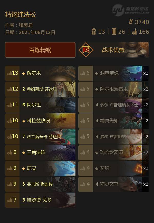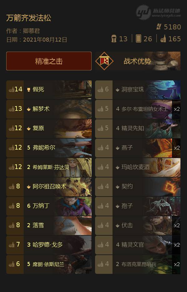 死灵术:在墓地里有精灵先知和倒数1点洞察宝珠的情况下,死灵术复活精灵先知能打出12点高节奏并在墓地存下一个洞察宝珠,这使得阿尔祖这套牌对岳父拉出双球的要求没有那么高,十分灵活;