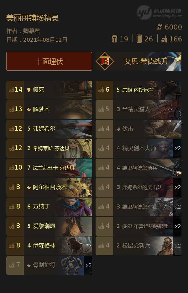 卡组思路:理想情况R1时用梅路辛进行存点/R2时复活出来/R3领袖新娘再复活一遍,但这种操作基本很难打出来,面对帝国时因为符咒的原因,梅路辛可能要压到很后面,大多数情况下的R1基本都是靠弃牌体系来赢下来,R2用剧情进行逼牌,尽量开出来梅路辛存一下点,R3时资源基本只剩下解牌,但是因为弟国R3的点数很有可能来自约阿西姆,而辛迪加因为赏金体系的原因R3短局会很卡手,松鼠和怪兽也可能会有一些大点数单位,所以群岛的R3会依靠亚克席这类牌来完成对局。