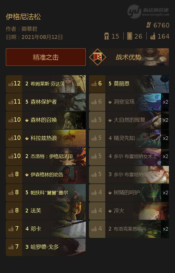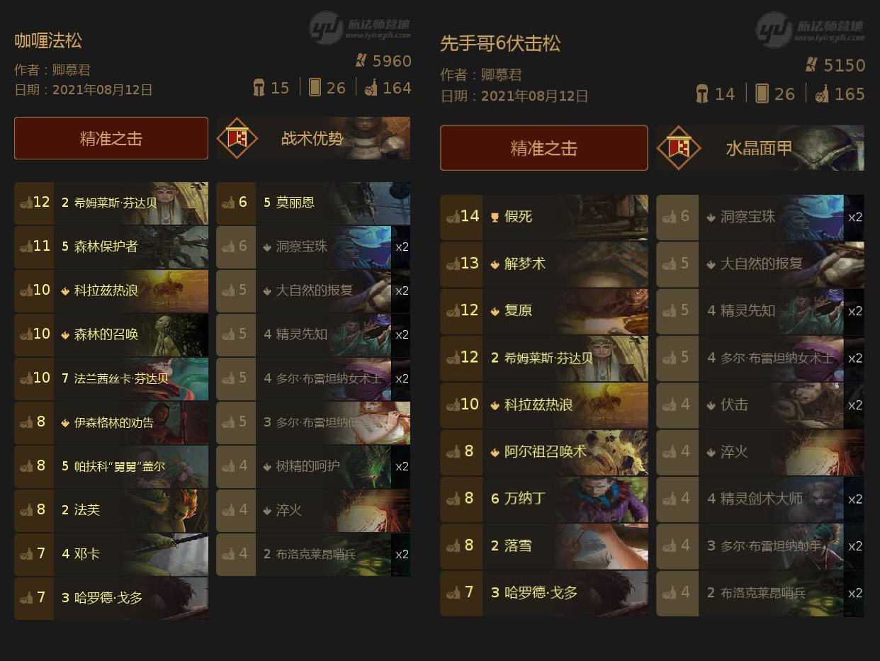 松鼠谁能力挽狂澜?精准之击法松已经给出了答案,新卡希姆莱斯·芬达贝、精灵先知、洞察宝珠成功激活了之前公布的两张新卡多尔·布雷坦纳女术士以及多尔·布雷坦纳低语者。由于这些新卡都是精灵,让精准之击有了携带剧情的理由。同时洞察宝珠这张卡也激活了之前几乎只在整活卡组出现的阿尔祖,让这张人体剧情有了速读的combo。16强预选赛中有14位选手携带了松鼠党,其中13名选手选择了带剧情的法松精准之击,有1名选手选择了气宗精准之击。