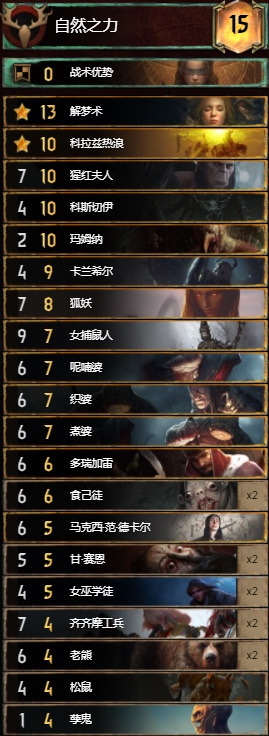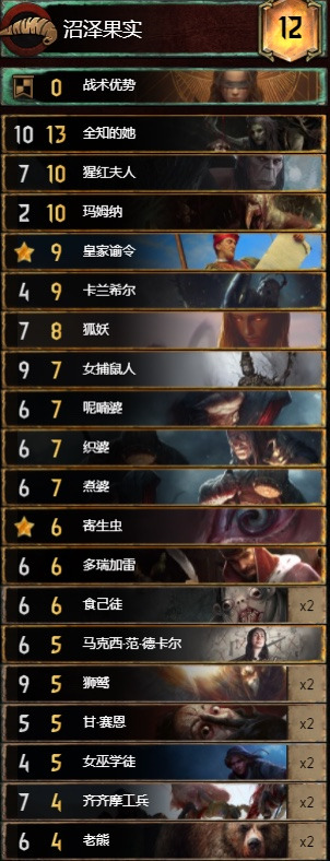 怪兽有两张强力新卡(玛姆纳、猩红夫人)的加入,不仅单卡提升了怪兽阵营的强度,同时也联动的提升了卡兰希尔以及中立卡乌里沃的伊达兰的收益,直接把怪兽的阵营胜率拉到了天梯第一。直接把怪兽的阵营胜率拉到了天梯第一。在领袖选择上蛆妈沼泽果实的热度要高于林妖科斯切伊,同时r1的强度以及r2逼牌给对手的压力都要优于林妖。林妖的优势则是可以选择赢下r1,r2如果牌不够好可以摆烂去逼牌去打一个短r3。林妖多了科斯切伊这一个核心。在五卡短局中,如果对手无法处理科斯切伊,则林妖的点数会大的很夸张。在刚刚结束的16强预选赛中每一位选手都携带了怪兽,其中13名选手选择了沼泽果实,3名选手选择了林妖。