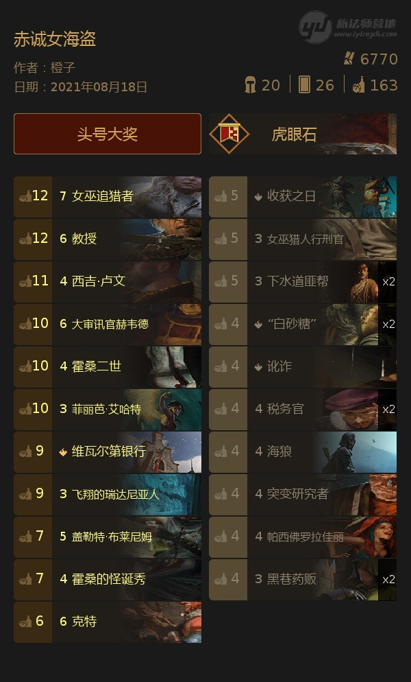 由于头号大奖遭遇2p的大削,现在天梯上最热门的辛迪加领袖重新变成了上限和操作难度都更高的盆满钵满。辛迪加新版本的新卡都与赏金有关,老阿姨女巫追猎者、霍桑的怪诞秀以及配套的赏金体系变成了现在罪行的主流。同时赏金体系对阵怪兽有很强的压制力。在与天梯第一阵营的直接较量中,辛迪加占据着一定的优势。不过在经历过版本初的高温之后,现在怪兽的浓度下降了一些,赏金套也要考虑下自己的构筑以面对更多的其他对局了。16强预选赛中每一位选手都携带了辛迪加且都选择了盆满钵满这个领袖。