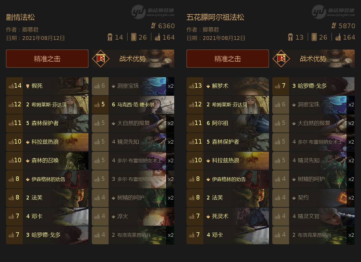 这里主要介绍这两套主流卡组,即大家说的烟花松鼠,一套是16强预选赛中大多数选手选择的剧情法松,一套是五花膘85胜率2600的阿尔祖法松。这两套牌在思路和节奏上相似,所以这里放在一起介绍。