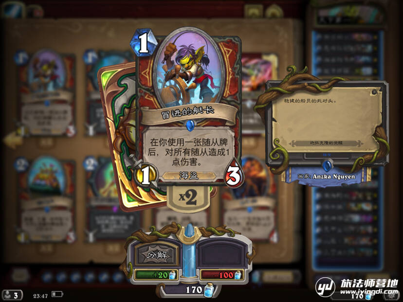这是一张神牌,1费顺滑无比,还可以连解带打,关键时刻还可以清理格子打出斩杀或者防止爆任务(口住)。鱼人萨和海军贼多的时候可以考虑带上~