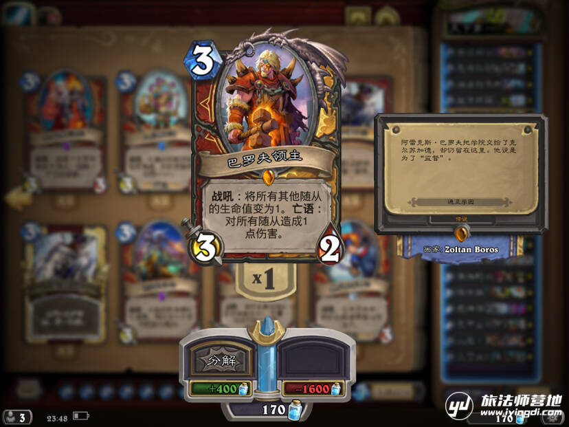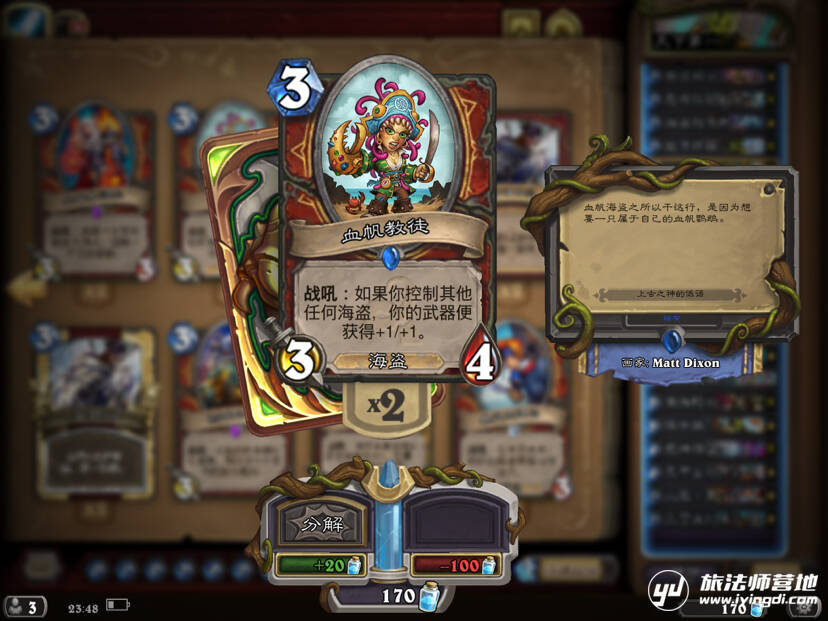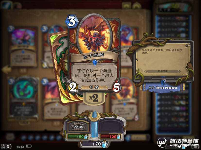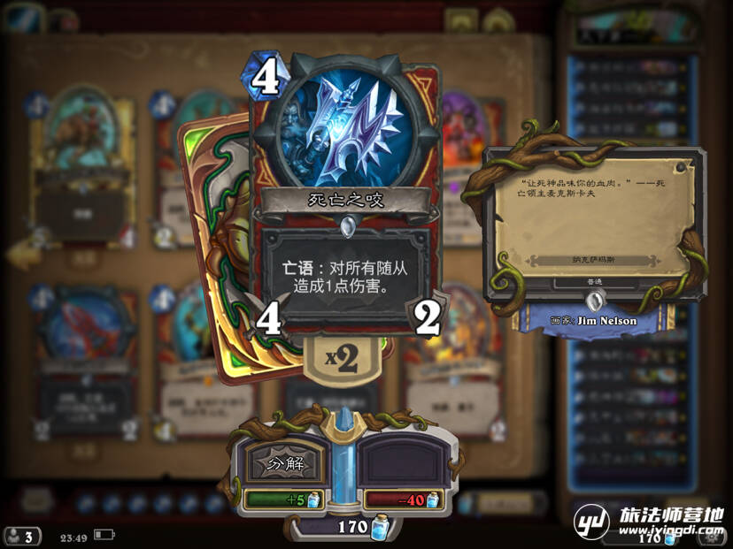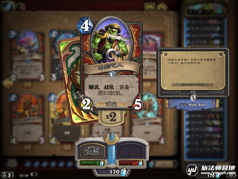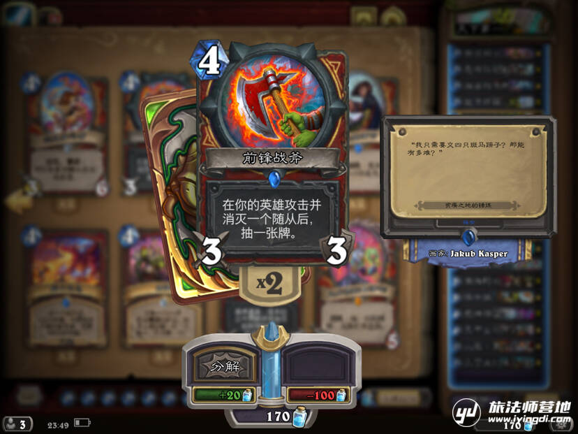 曾经在卡组里使用过并且非常非常优秀的一把刀,主要用来解场给自己过牌并且扩大场面优势,别再说什么快攻不解场了,现在大家都在赛马,站得住场面才能打死人。可是后来因为费用还是被舍弃了(叹气)