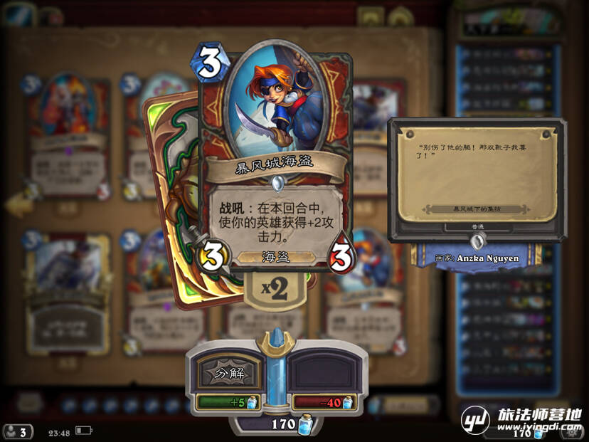 这也是一张从海盗战出现到现在都很好用的好卡,炸弹刀和傲娇斧时期的神器。可是在这个版本由于我们5到6费就可以稳定开大船并且每个回合都被强制换刀,所以她的作用也就被弱化了,往往只能做到加1攻的效果。但由于前期海盗锚加耐久还是很重要,所以我选择只带一张~