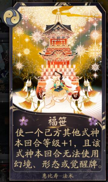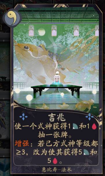 吉兆:朴实无华的加1/1并抽一张牌,前期我们打快直接贴给上场的式神来抵挡对面的攻势,如果我们3勾后抽到吉兆可以考虑等待我方全体3勾时打出增强效果加5/5,这时我们无论给谁强大的5/5身材加成都能让对面压力倍增。
