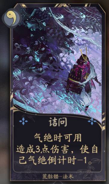 诘问:荒骷髅补刀低血式神的单解,因为我们这套解牌特别稀少,所以我们可以考虑携带诘问去补刀残血的式神如金鱼姬这类型,而且气绝依旧能使用让对手基本无法干扰我们,但缺点就是我们这套紫岩卡组只能解低血式神使用很难发挥其它作用,不像双鸟还能用在打脸或配合觉醒以津真天羽毛解场使用,我们紫岩使用就是局限性太大,快攻偏多的环境推荐大家携带