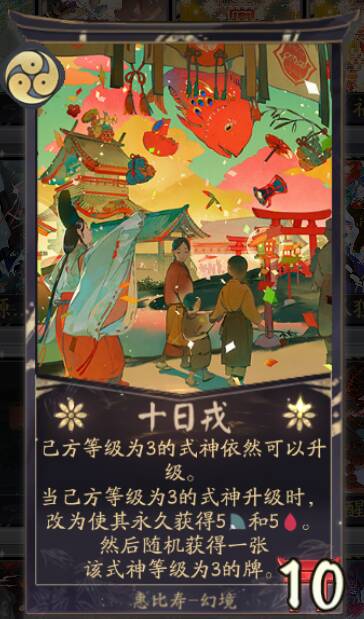另外惠比寿所有牌都是围绕升勾获得收益,所以往往大后期没勾可升时惠比寿就很难发挥效果,而十日戎突破升勾限制就让惠比寿的牌后期再次盘活。(所以推荐大家玩惠比寿时尽量考虑十日戎流因为这样才能发挥惠比寿的全部力量,纯辅助流就偏弱势一点会出现有废牌的情况)