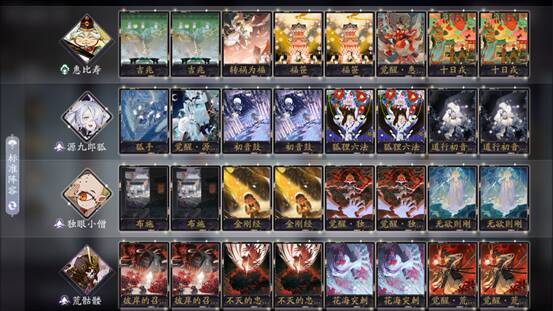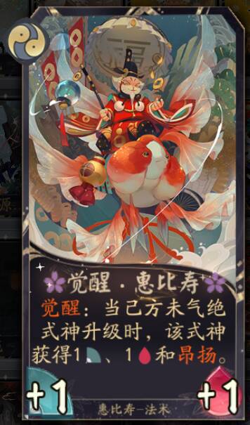 觉醒·惠比寿:觉醒升级后提高攻击力并且赋予昂扬的效果,觉醒给紫岩的提升非常不错,因为像小僧荒骷髅这种紫岩式神都血高攻低的情况,并且在我们这套中只有荒骷髅两个战斗牌,其它式神没办法提供多少攻击频率,所以惠比寿爷爷觉醒提供的昂扬就显的非常关键,让我们后期不会在因为每回合只能攻击一次而迟迟不能获胜。因为有十日戎配合觉醒所以我们每个回合都会有昂扬,这就是我们后期一回合多次进攻的关键。