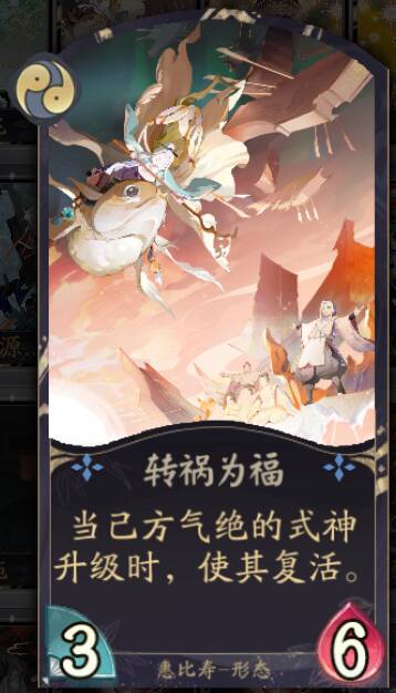 转祸为福:复活式神的形态,虽然复活的式神无法获得惠比寿爷爷升勾的身材加成,但是复活不管是配合荒骷髅移动站场或小僧复活挂形态都不错。而且中期情况紧急时我们也可以让惠比寿A上去变形态来阻挡对面的攻势,因为自身升勾提升了2血所以转祸为福的3/8还是很好阻挡对手。另外后期配合十日戎还能无限复活式神让我们节奏源源不断,就算对手这时候想解我们惠比寿爷爷但是3/9的身材已经让他很难分出太多资源来处理了。