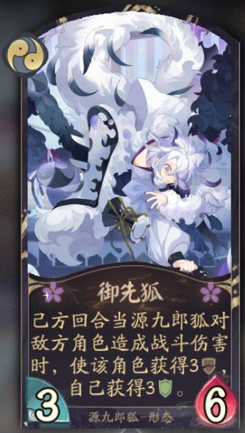 御先狐:中期源九郎狐形态,虽然自从御先狐削弱后大家就很少携带,但是他中期的能力依旧不错,因为源九郎狐基础能力叠加的血量中期能御先狐站一个非常扎实的场面,大家把2勾源九郎狐站场能变御先狐和不能变化的情况对比一下就能感觉到御先狐的强大了。
