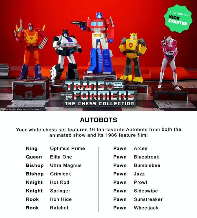 Hero Collector 是在雕像、国际象棋制造生产领域拥有丰富经验的国际收藏品牌,本次与孩之宝联手发起的「变形金刚国际象棋」是以许多变形金刚迷相当喜爱的 G1 动画为题设计,就与标准的国际象棋游戏一样,博派、狂派各自拥有 16 个经过手工涂装、高约 4.5~6 吋左右的变形金刚造型棋子,各位玩具人耳熟能详的擎天柱、威震天、大黄蜂、音波、铁皮、天王星......等角色都有参战!