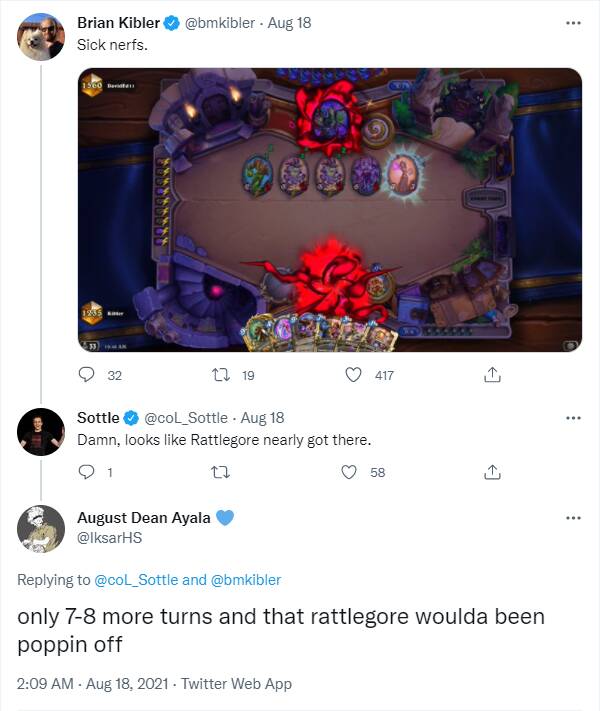 Iksar:我觉得假如OTK法师能泛滥到40%,我们现在讨论的肯定是它而不是术士了。不是说一套组合技存在了就需要改的。如果法师打快攻或控制的时候真有那么厉害,它的胜率应该不会是现在这个样子。