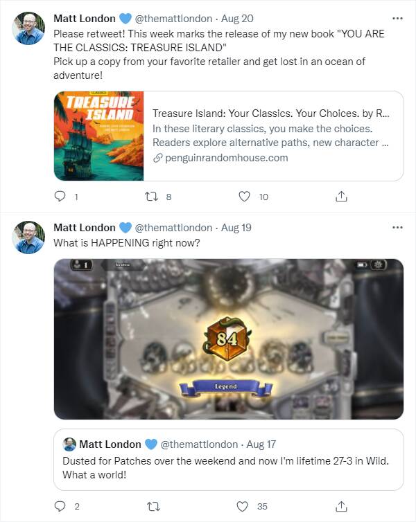 【Matt从不以炉石打得好自居,上周末他砸锅卖铁合了帕奇斯玩狂野暗牧,27-3打到前百。昨天他也真的初版了一本新书】