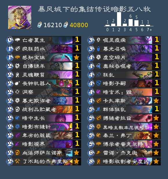 打奥秘法、鱼人萨以及海盗战时留牌或找针,针具有非常好的解场能力,可以让你在找资源的同时解光对手的场面,中后期靠大量的亡语随从过牌以及暮光召唤拉佛丁来抗攻击频率,而佛丁又可以帮助我们从牌库中找雷诺和拉兹来帮助我们更有效率的解场和完成斩杀。