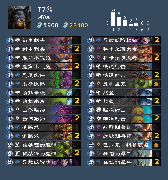 好吧,上一个卡组刚鞭尸完你就轮到了,但我并不认为换掉引月长弓或者随心口袋加入两张熊鲨的思路是错误的。和Seiko的那局属实有些冤家牌了。先是J4You想铺场面测对手有没有灵魂撕裂便没有出熊鲨,选择了另外一种即时伤害相近的打法,这样对**出扫5后便很难再处理熊鲨,但对手有罗姆和纳斯雷兹姆之触的combo也把场面解了个七七八八。到高费如果Seiko没有雄狮卫士,两个魔免熊鲨不说能再输出8点也能让猎人至少多两个回合去抓牌,鹿死谁手还真不好说。熊鲨额外的魔免属性和野兽属性让战歌驯兽师也能多出一个选项,也多出了新的一个34连拍的combo(即3费出熊鲨,4费出战歌驯兽师来buff场上的熊鲨)。熊鲨确实能够恶心到法师,瞎子以及非任务园以外的术士,它是能够作为类似曼科里克老婆那样持续输出的点,即便它有在火热促销射程里的这个缺陷。但 连狂踏的犀牛在对手随从稀少的对局里都很难有出色的表现,那与熊鲨对抢卡位的引月长弓就只会更加糟糕一些,随心口袋最初最好的一个作用就是配合科卡尔驯犬者能找毒蛇花去解大哥,即便它有更多的维度和用法但显然在这个环境里是不够优秀的。由此来看熊鲨确实算得上是一个积极的应对环境第29-30张的调整。