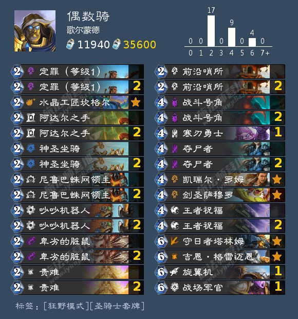 补丁上线后疯狂测试偶数骑,构筑有了一些调整,以极高的胜率打上前200,基本已经完善。214加责难卡对面,甚至还有脏鼠可以破坏组件,只要能神抽没有劣势对局,唯一缺点解场能力非常弱。要是螃蟹骑士生而平等还在2费这套牌将绝杀,足以竞技炉石历史上最强卡组,可惜带不得