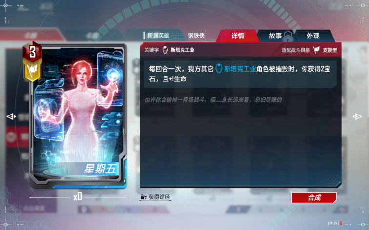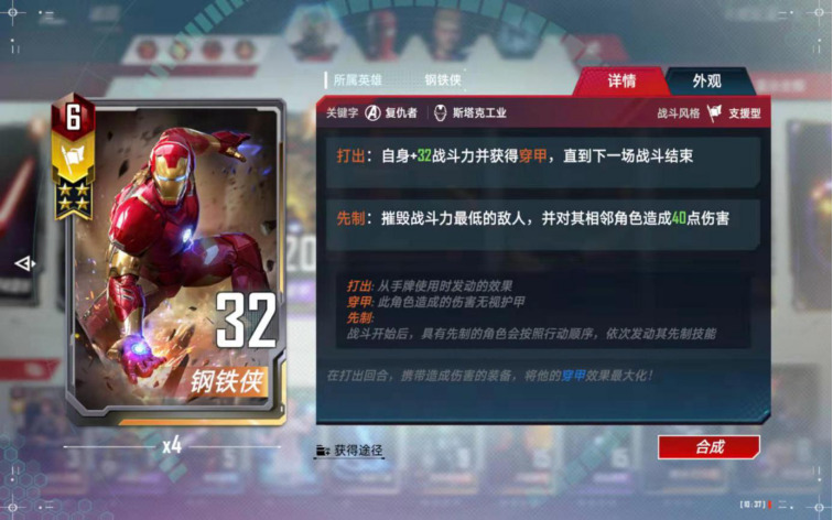 穿甲钢铁侠的打出,可以完全克制仙宫、复仇者等蓝队卡组,对整个队伍的提升是非常巨大的,穿甲钢铁侠还可以直接灭掉对手攻击最低的随从,运气好的话,还可以利用穿甲效果直接灭掉两三个,穿甲钢铁侠的标配武器是星期五。