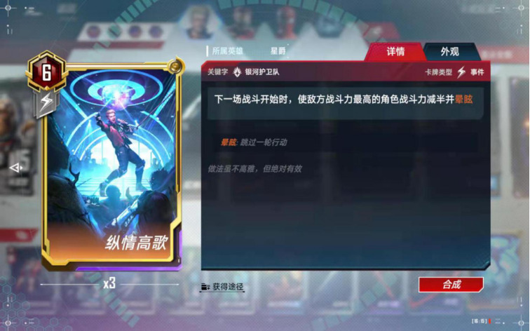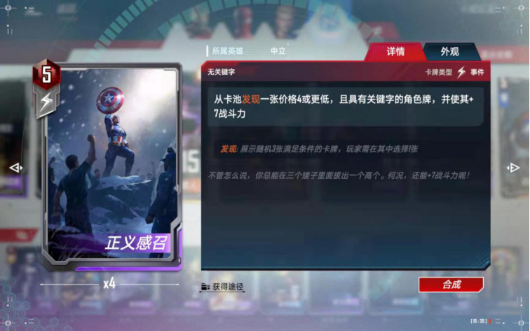 本卡组能不带“角色卡牌”的位置,全都用非角色卡牌代替了,在牌库过滤好了以后,正义感召找究极钢铁侠就非常给力了,记住正义感召不能用来找火箭与格鲁特,不会返回援军宝石的。