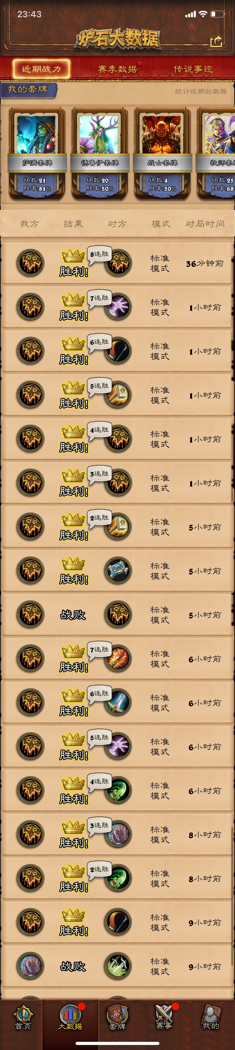 下图是我的战绩。虽然显示了21场,但那5场是补丁之前打的,不算数。在玩萨满之前我一直用德鲁伊在钻5摩擦,20把原地踏步真的麻了,后来换了萨满直接连胜,我自己都惊呆了。