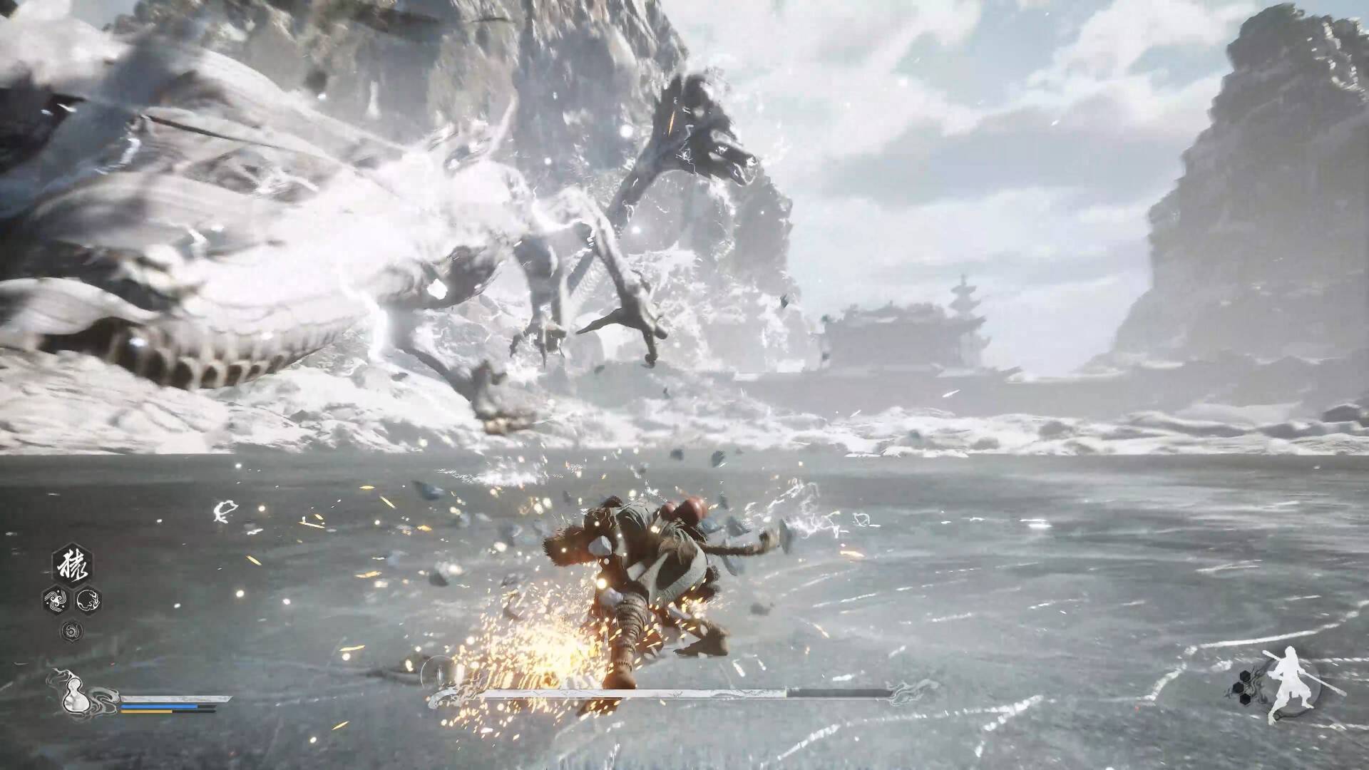 本段实机先以一段叙述开场,接着这次的战斗舞台来到一座白雪皑皑的雪地上。实机演示展示了全新的敌人,以及随着悟空一招一式的放出,雪地与之的互动表现。